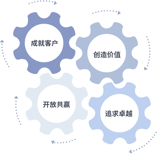 成就客户是一切决策的出发点,,创造价值是衡量所有工作的标准,,,,追求卓越是我们做事做人的态度,,,,开放共赢是我们的格局也是最终的结果。。价值观的齿轮环环相扣,,推动着组织里的每个人不断向前。。